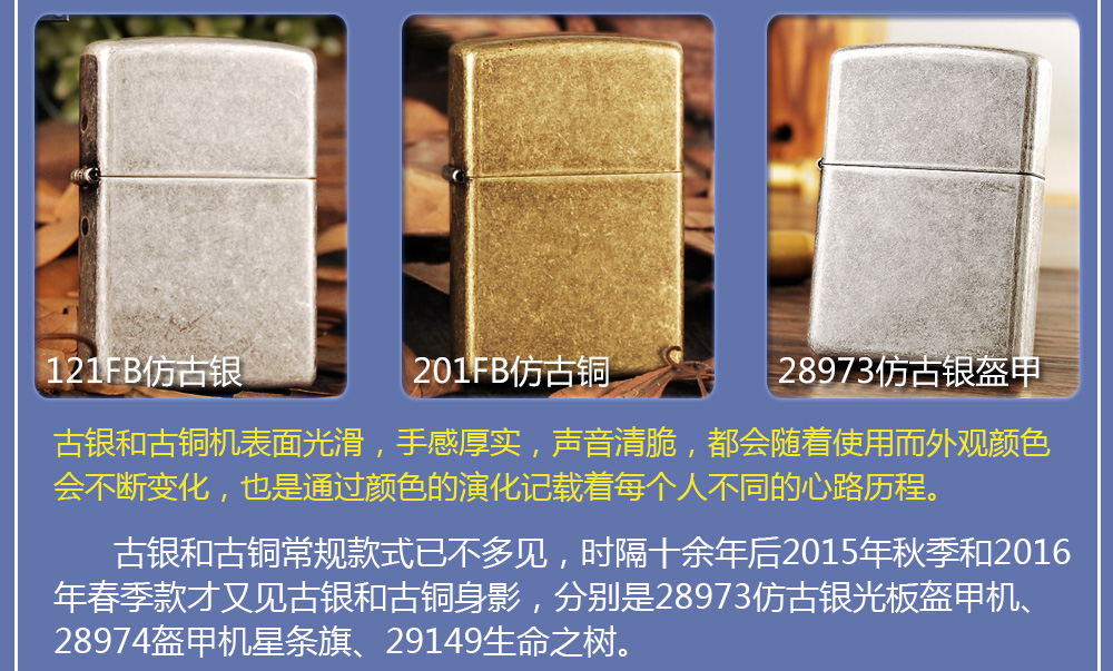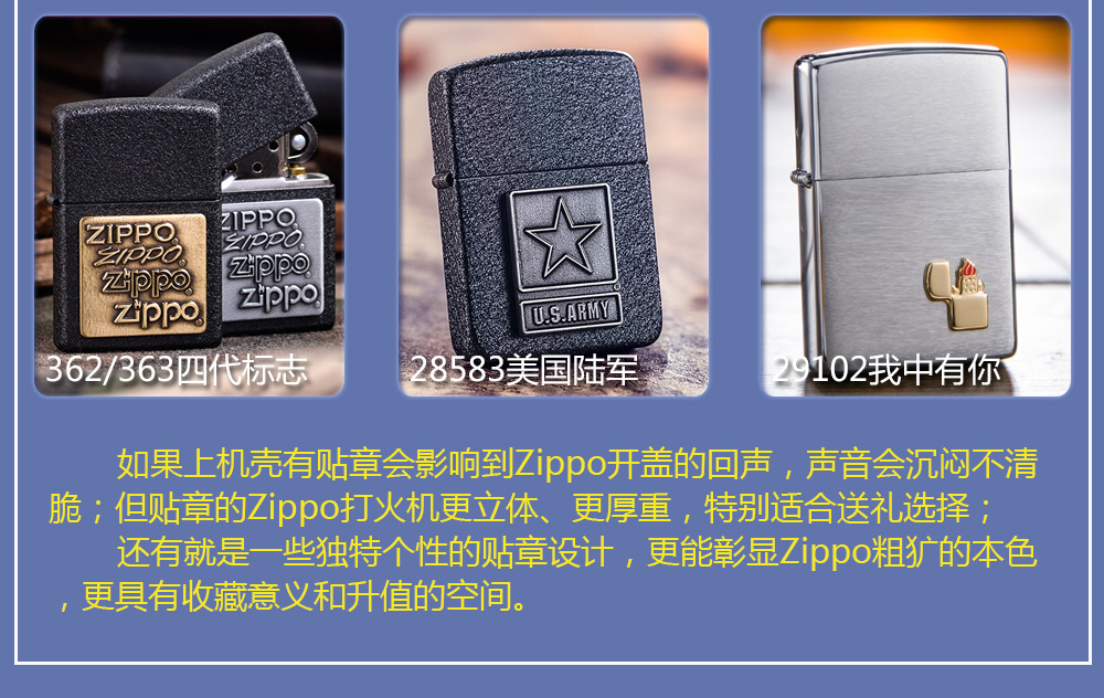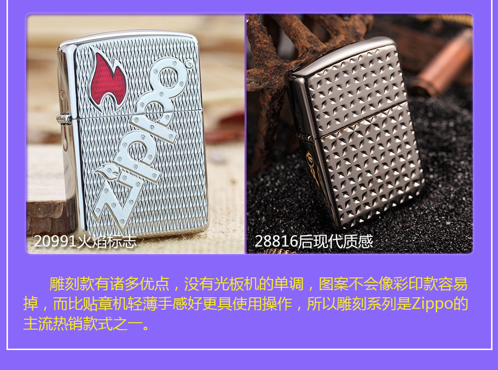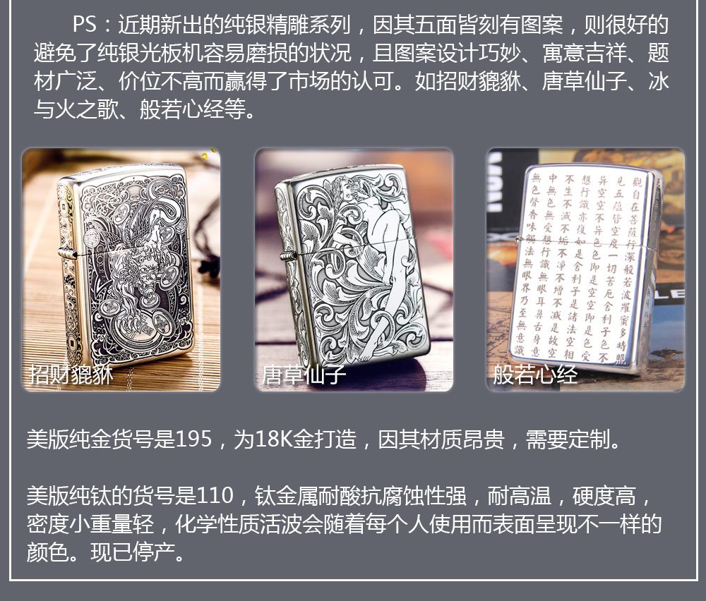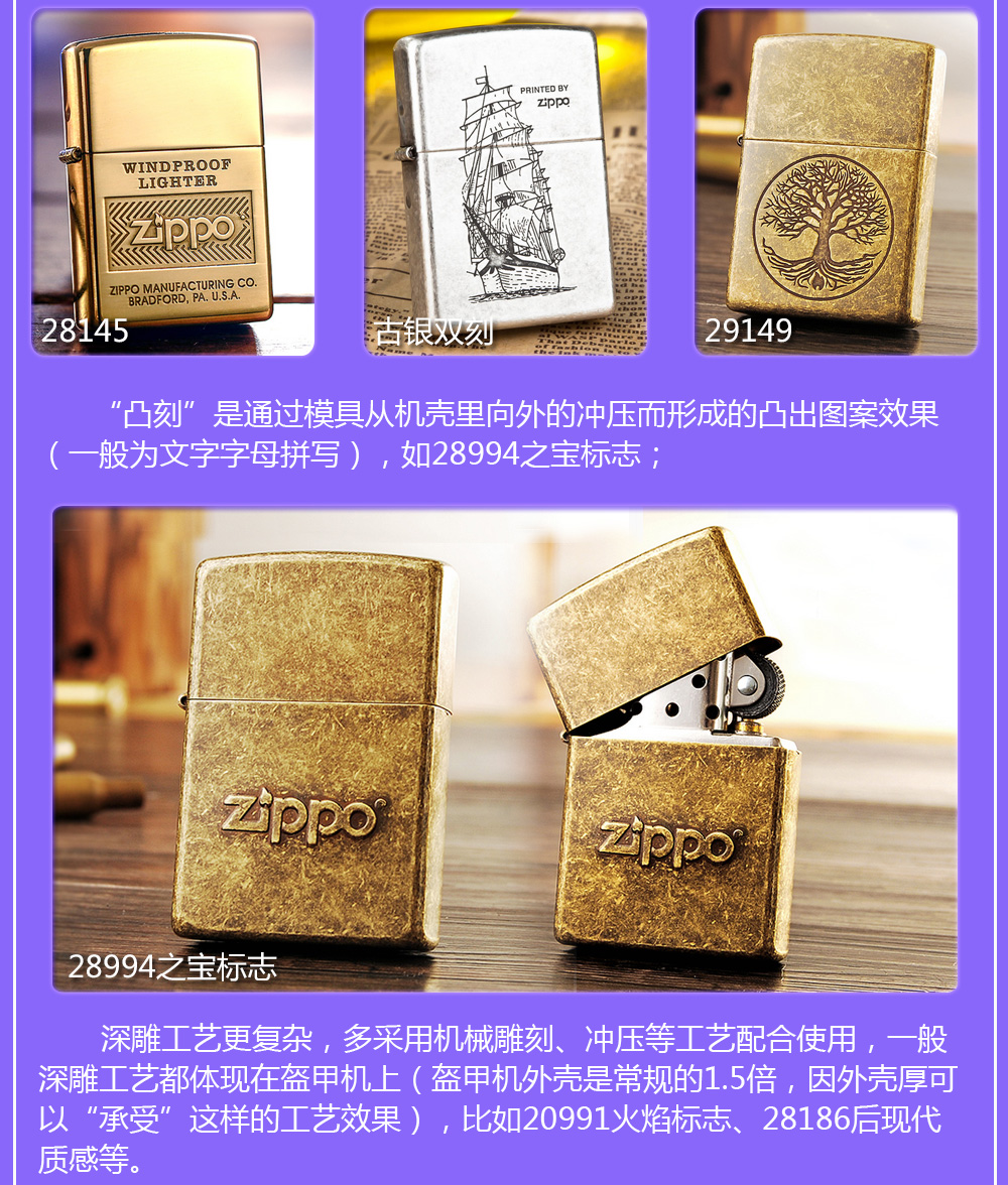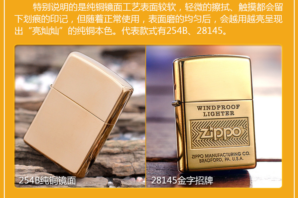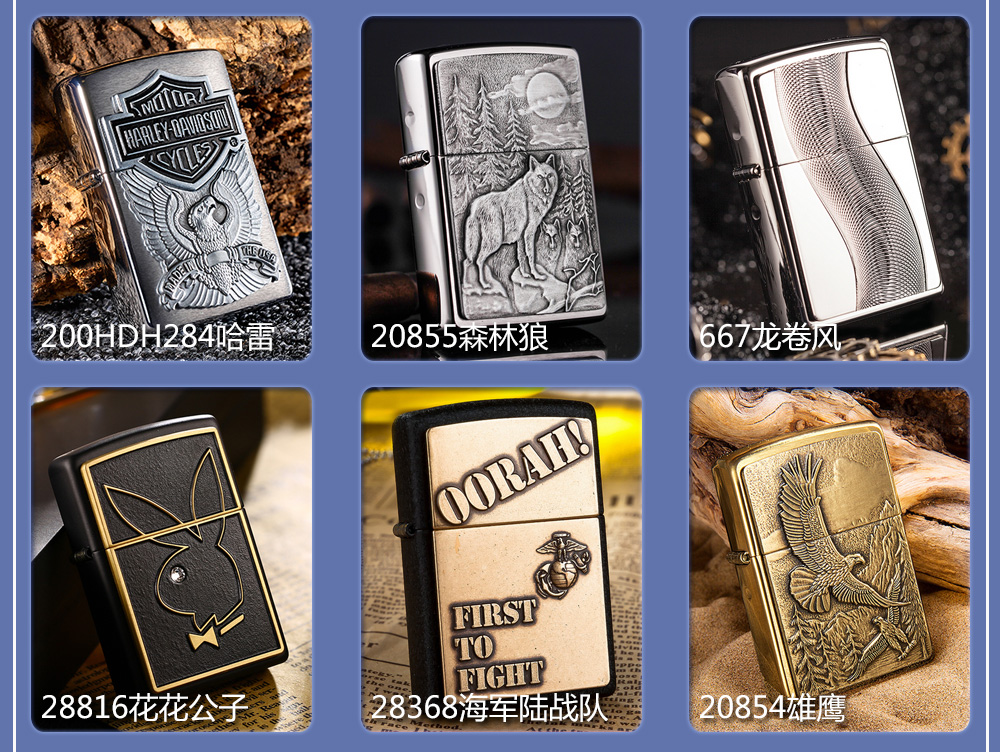 Zippo拥有五个产地:美国(美版)、日本、韩国、德国(欧版)以及02年7月31日停产的加拿大工厂。 由二十二个不同部分,一百零八道制造操作程序成,其机壳是铜质(黄铜)的,机芯则是合金的。 美国(美版):美国本土机,美版的Zippo粗犷而豪放。worldwide和only USA标签的区别,worldwide是在美国生产销往世界各地,而only USA仅在美国出售,多为定制机,比如骆驼camel、花花公子Playboy的封面女郎、具有美国元素的鹰、国旗、自由女神像等等。