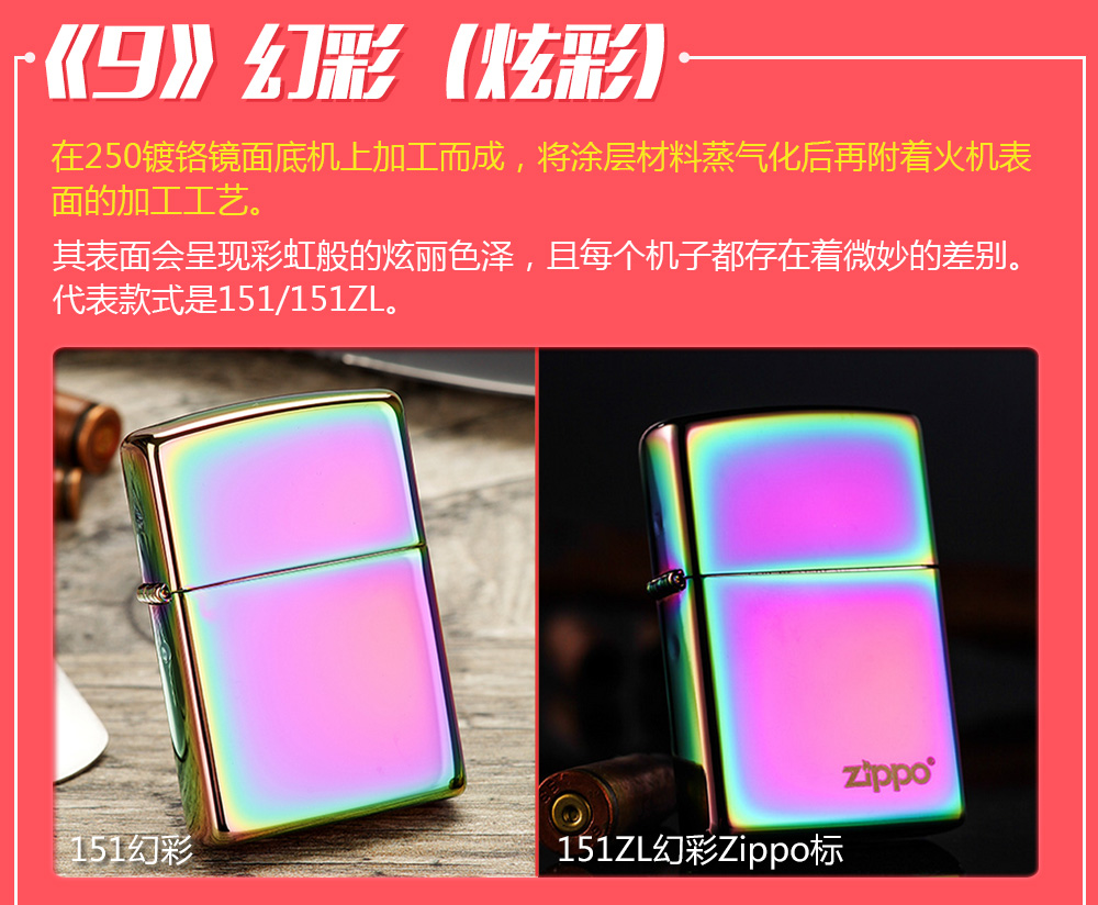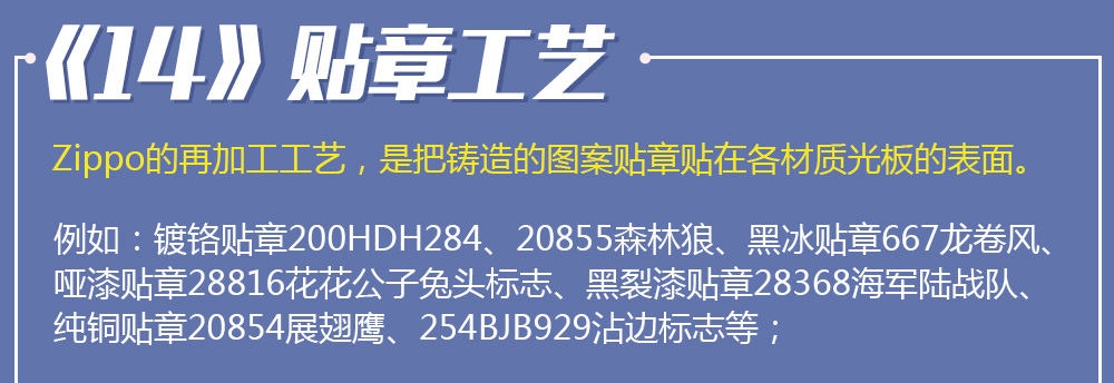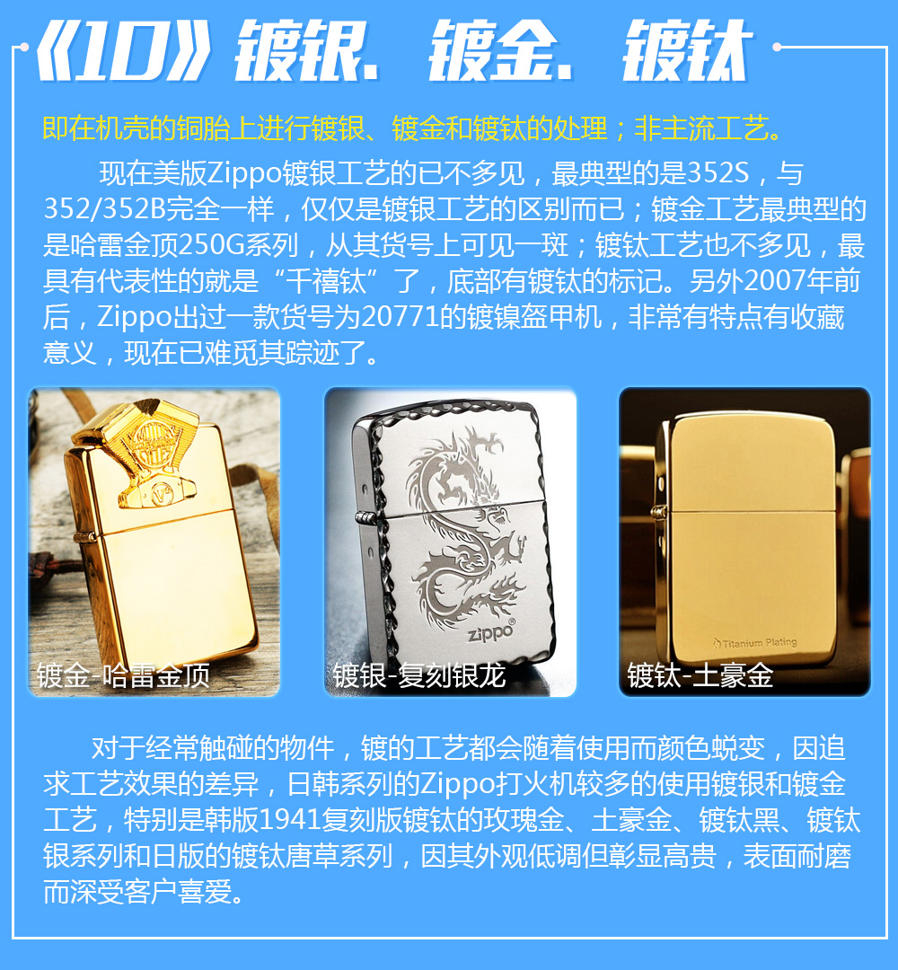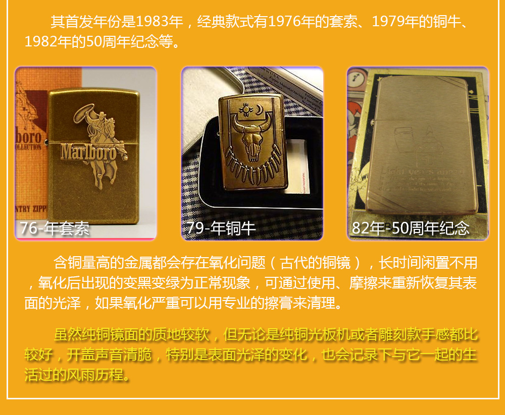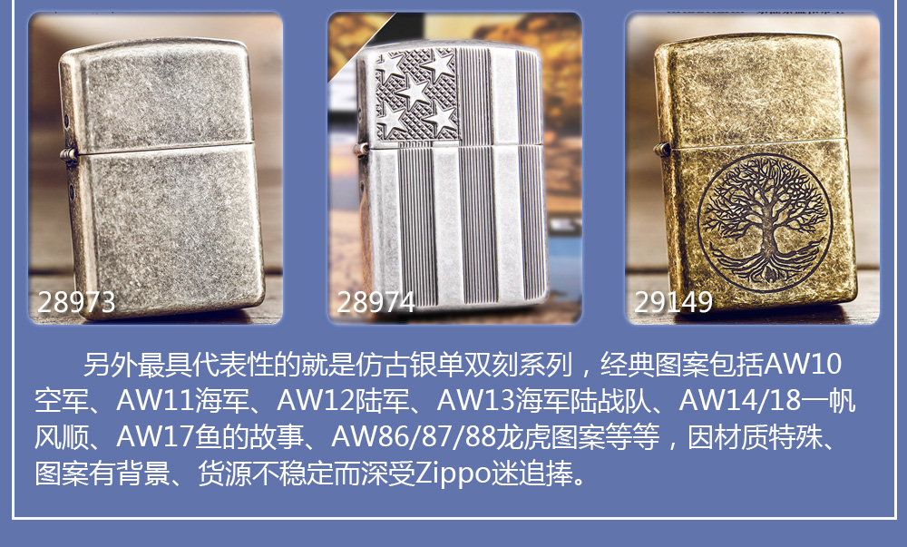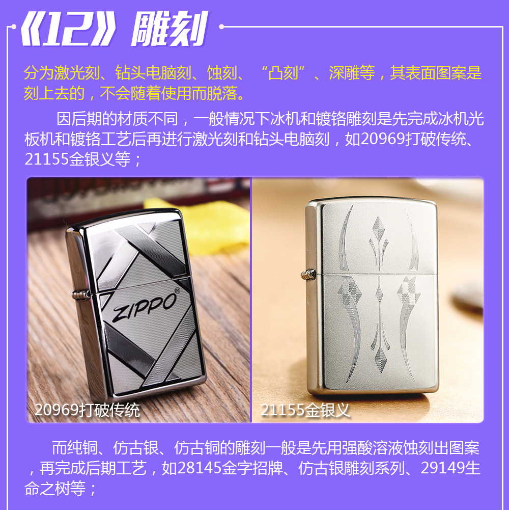 Zippo拥有五个产地:美国(美版)、日本、韩国、德国(欧版)以及02年7月31日停产的加拿大工厂。 由二十二个不同部分,一百零八道制造操作程序成,其机壳是铜质(黄铜)的,机芯则是合金的。 美国(美版):美国本土机,美版的Zippo粗犷而豪放。worldwide和only USA标签的区别,worldwide是在美国生产销往世界各地,而only USA仅在美国出售,多为定制机,比如骆驼camel、花花公子Playboy的封面女郎、具有美国元素的鹰、国旗、自由女神像等等。