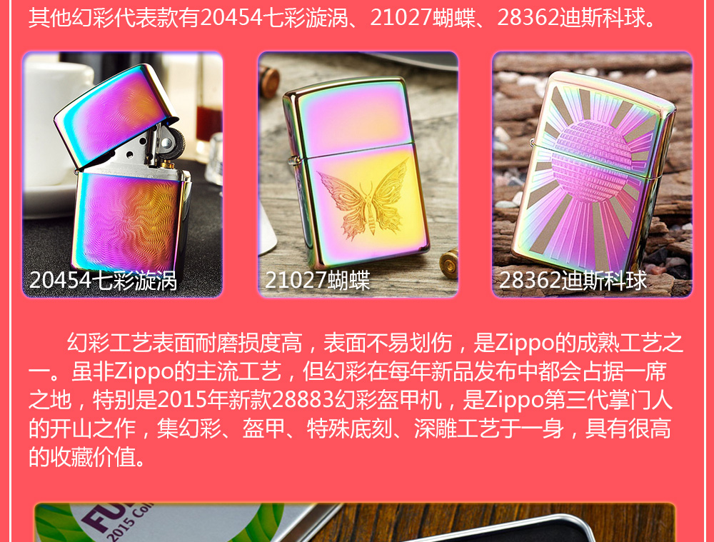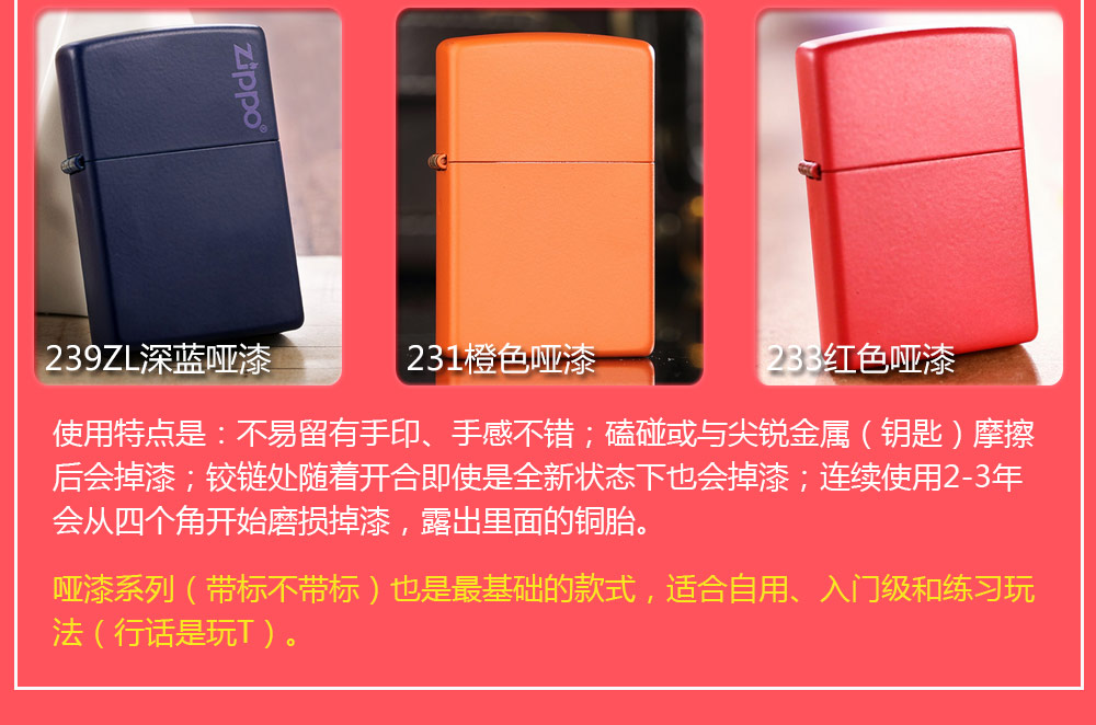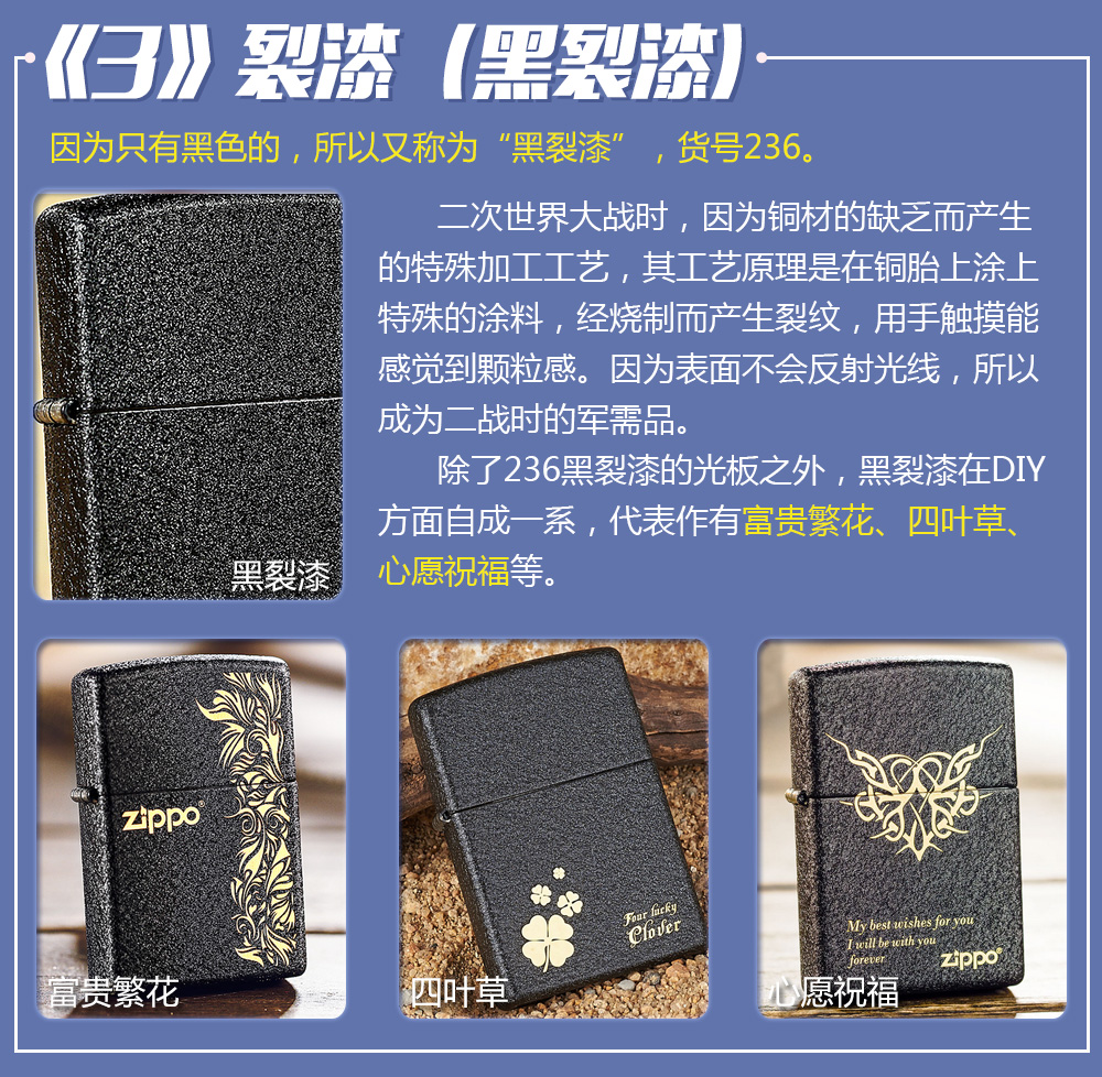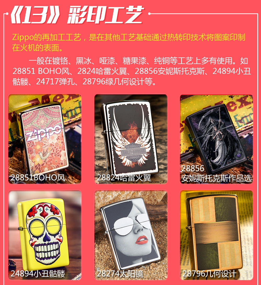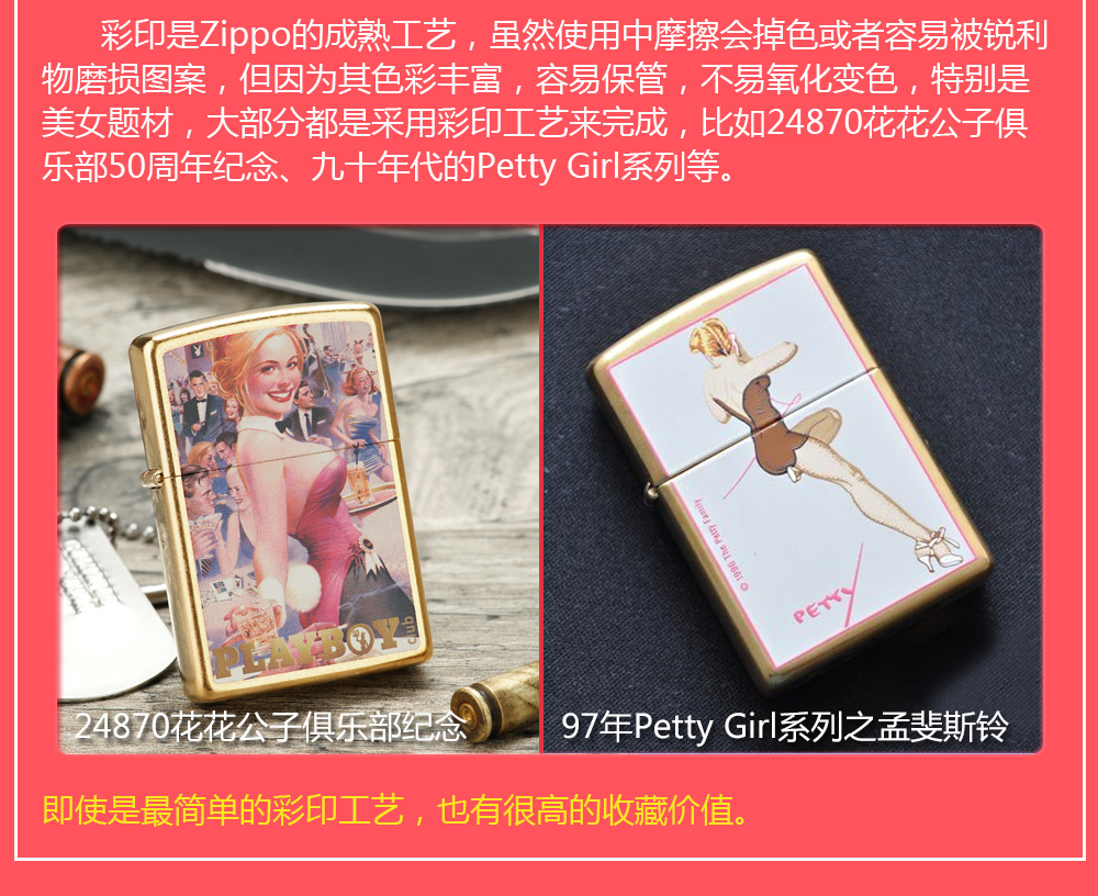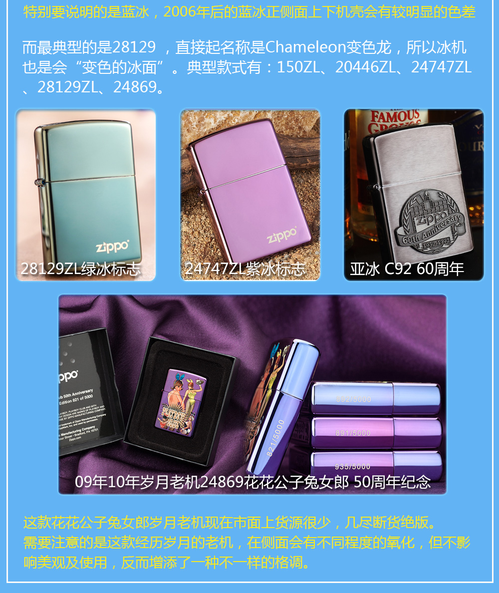 Zippo拥有五个产地:美国(美版)、日本、韩国、德国(欧版)以及02年7月31日停产的加拿大工厂。 由二十二个不同部分,一百零八道制造操作程序成,其机壳是铜质(黄铜)的,机芯则是合金的。 美国(美版):美国本土机,美版的Zippo粗犷而豪放。worldwide和only USA标签的区别,worldwide是在美国生产销往世界各地,而only USA仅在美国出售,多为定制机,比如骆驼camel、花花公子Playboy的封面女郎、具有美国元素的鹰、国旗、自由女神像等等。