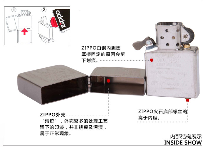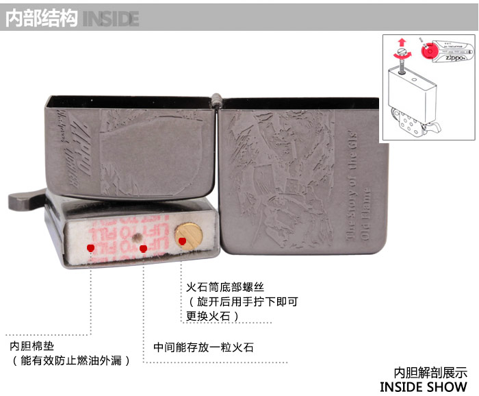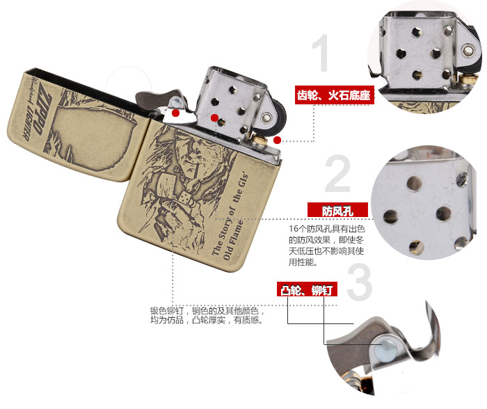 品牌:Zippo/之宝 商品净重:约56.00g 材质工艺:1941复刻纯铜雕刻 温馨提示:新机不含油,需加油才能使用,建议与燃油一并订购。 【时尚坐标 致力于Zippo的推广和文化的传播】 |